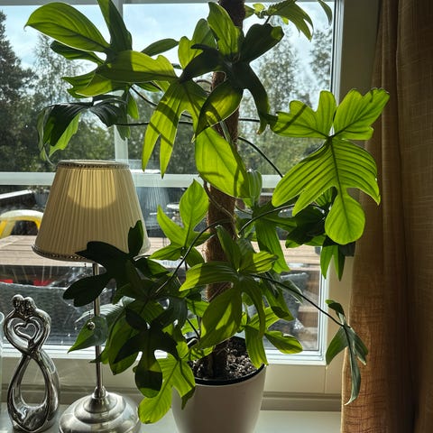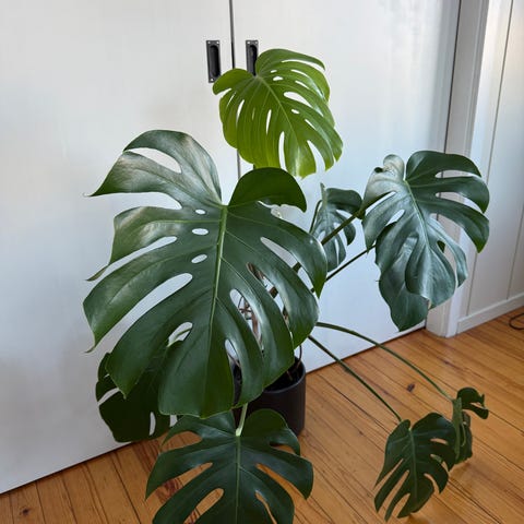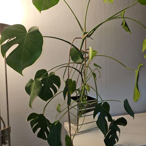 Monstera plante med store, grønne blader og hvit potte. Planten har flere lange stilker og er egnet som dekorativ inneplante. Trenger nok litt kjærlighet. Potta er fin da 👌