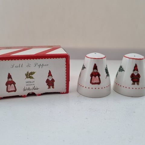 Salt- og pepperbøsse formet som nisselue med mus. Bøssene er designet for å se ut som røde nisseluer med små grå mus som titter frem. Luene har også søt gulldusk. Laget i keramikk. Fargen er rød brun. Bøssene passer perfekt til julebordet og som en koselig dekorasjon i hjemmet i juletiden. Beklager at noen av bildene er litt utydelige. Den med 3 hull: Høyde 6 cm, bredde 7,5 cm, dybde 5,5 cm. Den med 5 hull: Høyde 6,5 cm, lengde 7 cm, dybde 4,5 cm. Vekt: 176 g. Hele og pene. Selges kr. 100.- Hentes Jevnaker eller sendes. Ved sending tilkommer frakt med sporing kr. 70.- med Postnord. Pakker godt. Har vipps.