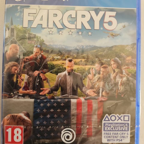 Ubisoft Far Cry 5 Playstation 4 spill. Inkluderer spillinnhold og er beregnet for aldersgruppen 18+. Spilltypen er action-eventyr i åpen verden, utviklet for Playstation 4-konsollen.