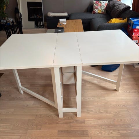 Selger et hvitt, praktisk IKEA Norden slagbord. Kun 300 cm bredt når det er sammenslått. Utslått måler det 152 cm.