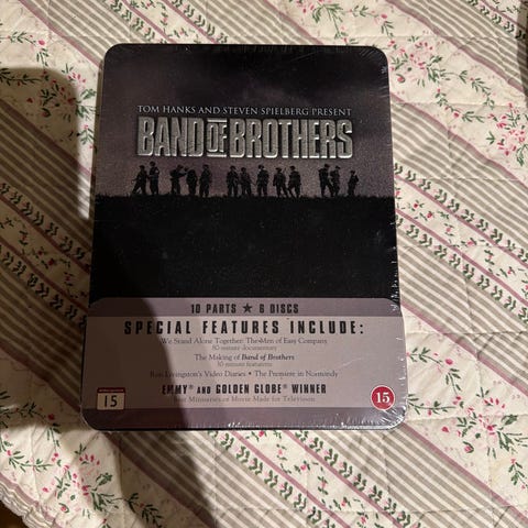Band of Brothers DVD-bokssett i Steelbook-utgave. Inneholder flere DVD-plater med serien Band of Brothers, inkludert tilhørende bokser og innhold som vises på bildene.