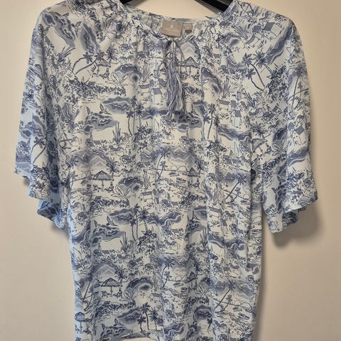 Laget i 100% silke. Hvit med møntser i blå, lilla, rosa og litt beige.
