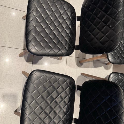Gir bort stolene fordi jeg ikke lenger trenger dem etter oppussing av kjøkken. Alle fire stolene er identiske. Enkle sitteputer som vist på bildet følger med. Gis bort mot henting.