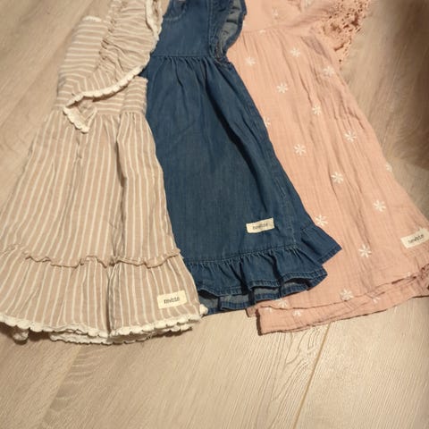 To fint brukte kjoler og et sett med bluse og rumper fra Newbie i str. 86 (12-18 mnd).