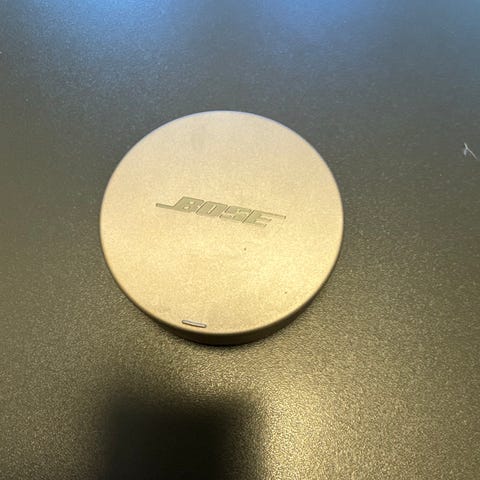 1. Lokket med Bose-logoen er løsrevet. 2 ørepropper følger med, ikke testet.