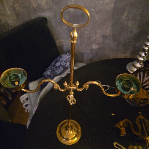 Antikk justerbar henge-lysestake i massiv messing, trolig produsert ca. 1880–1910. Klassisk pre-elektrisk belysning brukt i kjøkken, spisestue eller arbeidsrom.