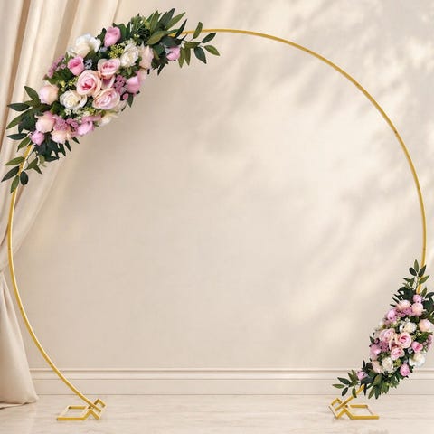 Dekorativ metallbue i gullfarge, egnet for bruk i ulike arrangementer som bryllup, fester og fotografering. Buen har en rund form og kan pyntes med blomster, stoff eller ballonger etter ønske. Den gir en estetisk ramme og kan plasseres både innendørs og utendørs.