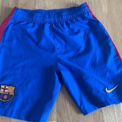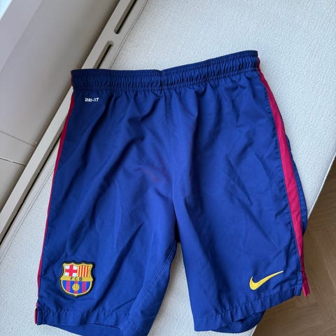 Nike FC Barcelona fotballshorts i størrelse M, blå farge. Shortsen er laget med Dri-FIT materiale som gir fukttransport for bedre komfort under aktivitet. Designet for menn og egnet til fotball.