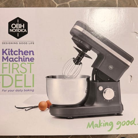 Kjøkkenmaskin med svart farge og rustfri stålbolle. Maskinen leveres med visp, deigkrok og eltekrok. Passer til baking og matlaging som krever elting, miksing og visping. selges da den ikke blir brukt nok.