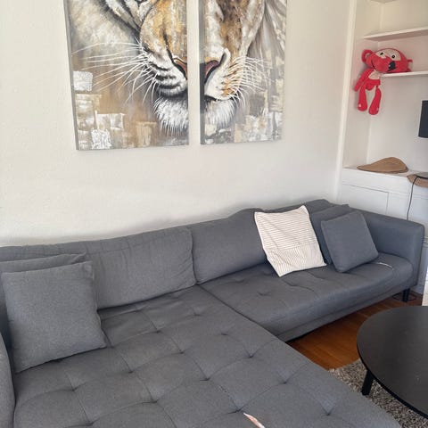 Stor, deilig sofa med sjeselong i gråtone. Sofaputene har dunfyll og er veldig behagelige. Sofaen står på Nordstrand og må hentes dagen før min nye sofa blir levert. Det trengs to sterke personer for å løfte den. Kan deles i fire deler og fyller en vanlig varebil to turer. Står i 1. etg. Trekkene kan vaskes. Den har veldig lite bruksslitasje. Det kan ta litt tid før jeg svarer, men det kommer svar i løpet av en dag :)