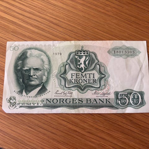 Norges Bank 50 kroner seddel fra 2015. Sedlen har grønne og hvite fargetoner med portrett og ulike sikkerhetsdetaljer. Det Peter Christen Asbjørnsen som er avbildet på forsiden.