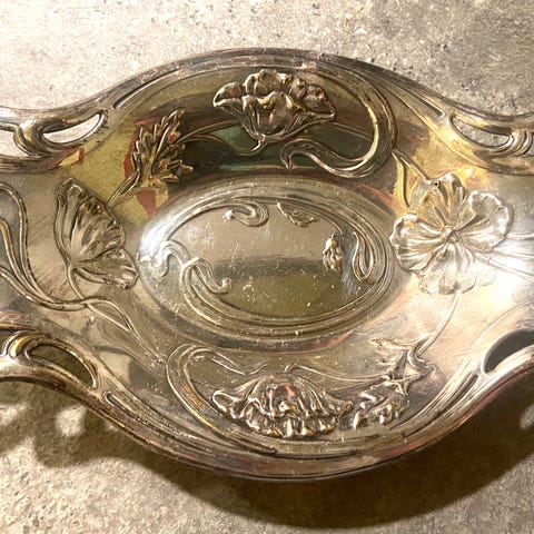 Typisk jugendstil fat antagelig fra Sentral Europa med slynger, blomster og kvinnehoder. 25 x 14 cm. Ca 130 år gammel. Kan hentes på Majorstuen eller sendes.