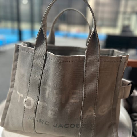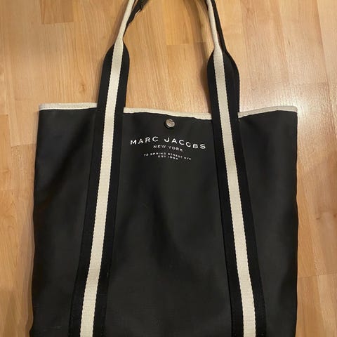 Selger fint brukt Medium Marc Jacobs The Tote Bag stoffveske for dame i svart farge. Vesken har to håndtak og en avtagbar skulderrem. Den har glidelås på toppen og romslig innside uten ekstra lommer.