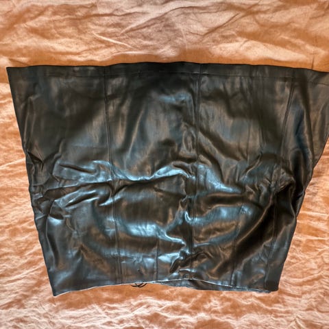 Ny! Ubrukt med tag på. Lekkert Bik Bok svart «skinn imitasjon» skjørt , størrelse 46. Skjørtet har en glatt overflate og en enkel design uten ekstra mønster eller detaljer. Egnet for kvinner. Liten splitt foran. Mykt behagelig materiale. Ny pris kr 399, selges kr 140. Kan sendes evt avtale overlev Oslo. Dyr og røykfritt hjem🍃samsender gjerne
