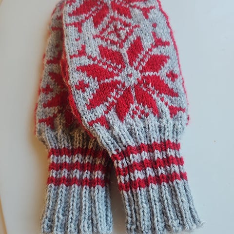 Design/strikk og toving v/selger. Strikket i kvalitetsgarn fra Rauma. 100% norsk ull. Mål: Lengde 33 cm, bredde 12,5 cm. Tommel 8,5 cm lang og 5,5 cm bred. Vottene har påsydd vaskeanvisning med info.
