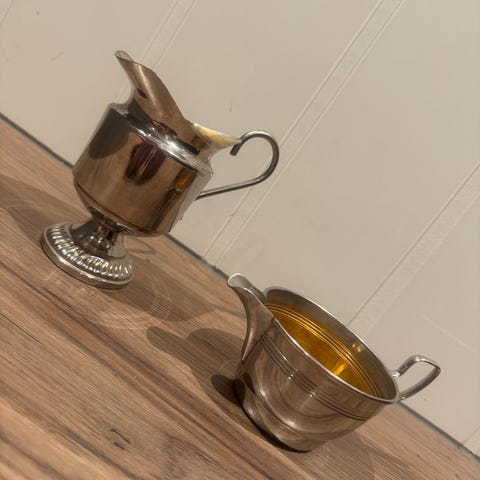 Alle delene har normal patina og bruksslitasje som forventet av alder, noe som gir et autentisk vintage preg. Noen deler har lys/forgylt innside. Perfekt til klassisk interiør, vitrineskap eller borddekking.