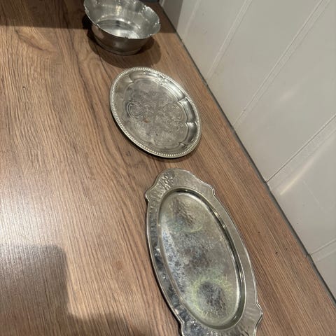 Selger et sett med dekorative skåler og serveringsdeler i sølvplett. Består av flere ulike deler i klassisk stil, blant annet skåler med hanker og en skål på fot. Flott som dekor, til servering eller for samlere.