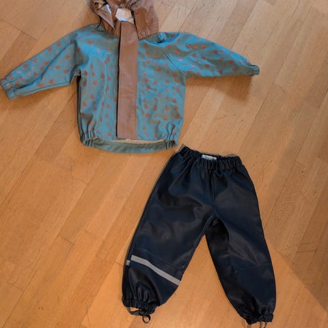 Regnsettet er helt, og fotstrikkene er intakte. Det er i tillegg «pant» på både jakke og bukse dersom plaggene levers til butikk (50kr pr del) ☔️