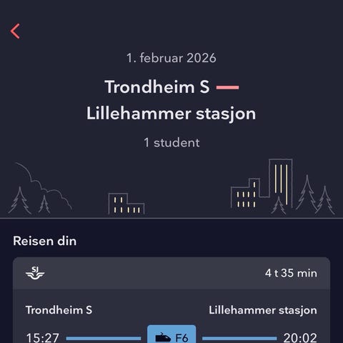 Lillehammer-Trondheim 22.01.26 kl. 16.02. 200 per billett eller 400 samlet.