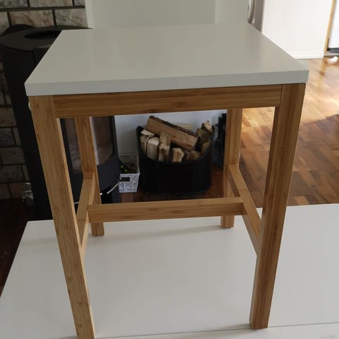 Sammenleggbar bambuskrakk trukket med kremfarget stoff.