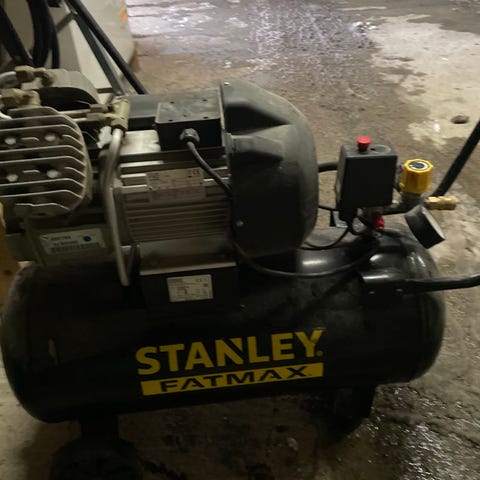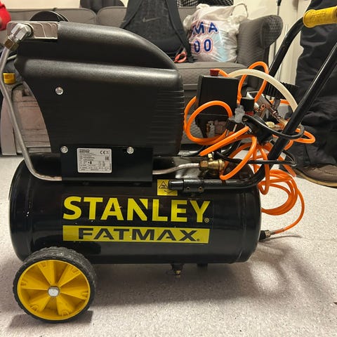 Fatmax Star kompressor med tilkoblingsslanger. Kompressoren er utstyrt med et svart deksel og gul hjul for enkel forflytning. Egnet for lufttrykk og diverse kompressorpåførte oppgaver.