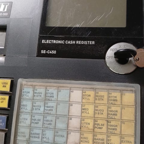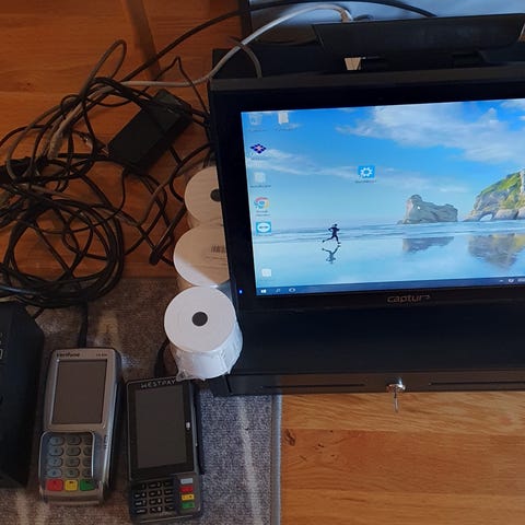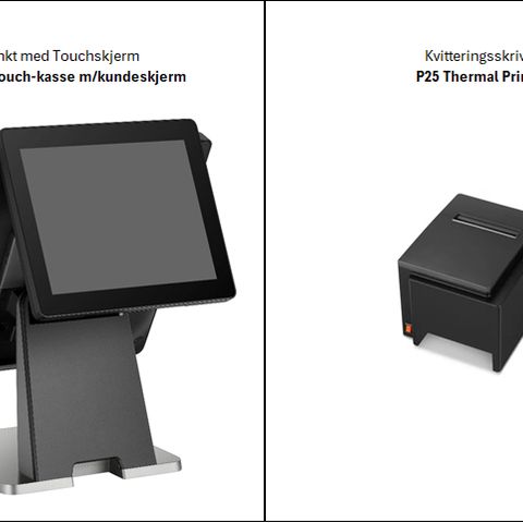 Komp kassesystem f/ butikk. Består av Skjerm (touch), kundedisplay, kvitteringsprinter, scanner, tastatur, mus, kassaskuff og printer for etiketter samt bankterminal m/holder drei