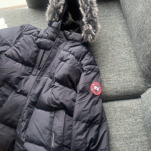 Canada Goose Parka i beige farge, størrelse S/P, designet for dame. Jakken har en hette med pelskant og to frontlommer. Materialet er tilpasset for å gi varme og beskyttelse i kalde værforhold.