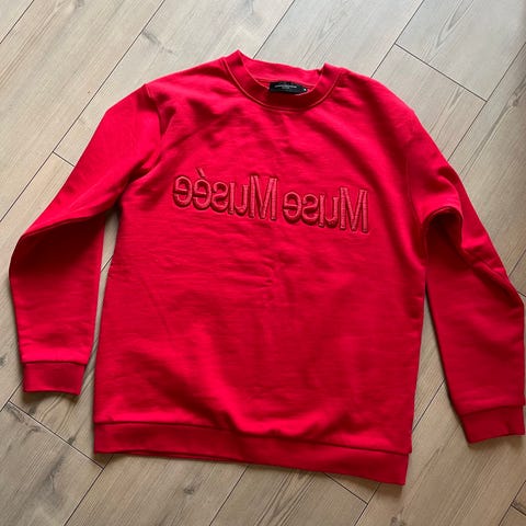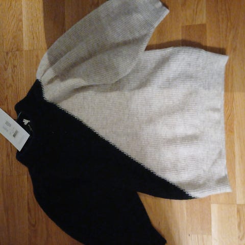 Copenhagen Muse genser i alpakkaull, størrelse S, farge grå med oransje striper. Genseren er laget for kvinner og har en rund hals.