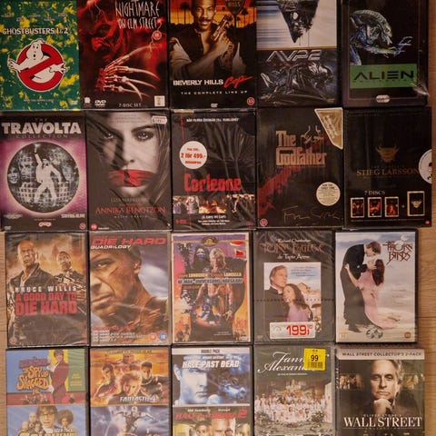Samling av DVD filmer med ulike titler inkludert western, science fiction, action og eventyr. Inneholder filmer som Planet of the Apes-serien, V for Vendetta, District 9, Blade Runner, og flere. Passer for filminteresserte med varierte sjangre. 10 stk