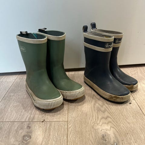 Dei blå er i strl. 23 og de gule i strl. 24. Selges for 100,-