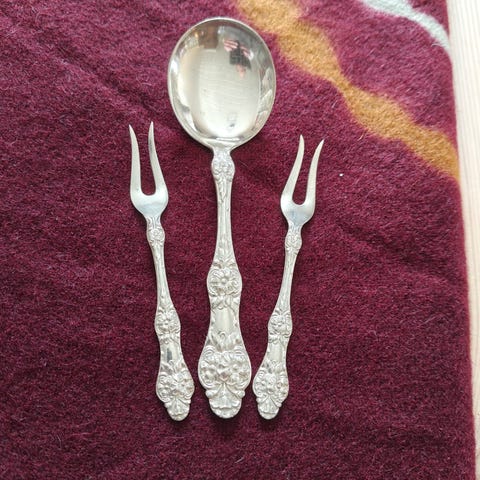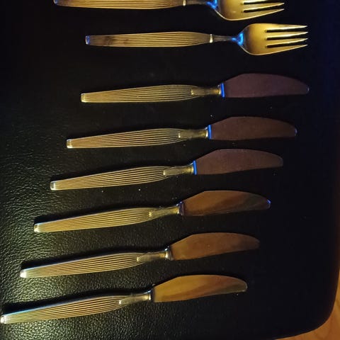 Svensk spets, sølvplett. 6 skjeer og 8 gafler