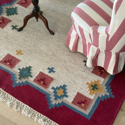 • Håndvevd og vakkert mønstret kelimteppe i ull
