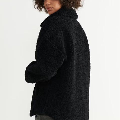 Teddyjakke med oversized passform. Str. S. Jakken er hvit og har knapping på forsiden. Den har krage og lommer i sidene.