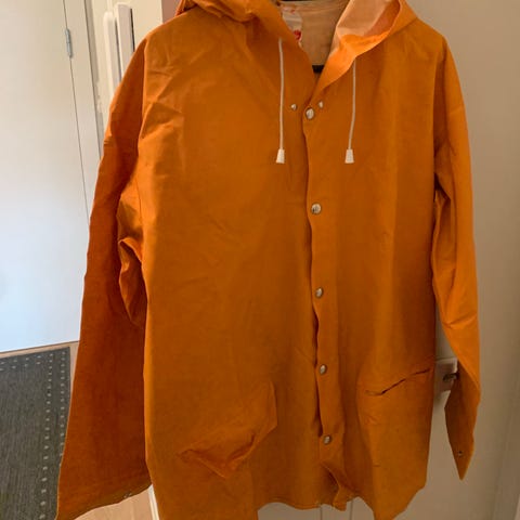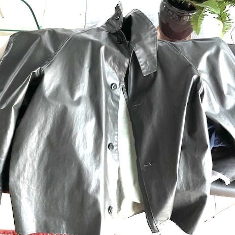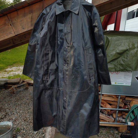 Regntøy, regnfrakk, regnjakke, regnhyre, oljehyre, oljebukse, oljejakke, oljeklede, oljeklæde, oljeklær, pvc, vinyl, plast, regnbukse.