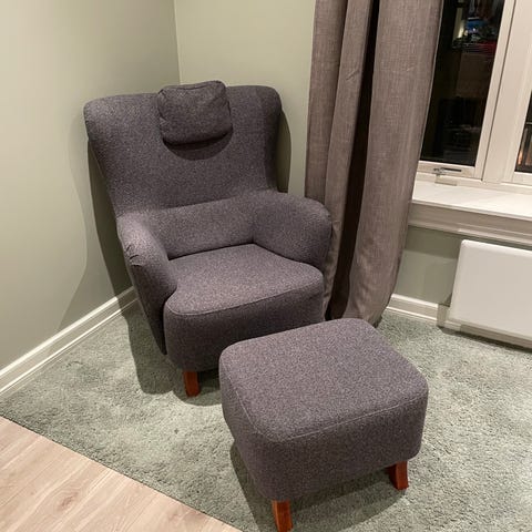 Grå gyngestol i svært god stand. For det meste stått på loftstue og dermed ikke brukt mye. Ingen mangler eller synlig slitasje. Ingen knirk el. Trekk på sittepute kan tas av for vask etc.