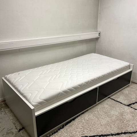 Veldig god seng, som har gavl på ene kortsiden og en oppbevaringsenhet som rommer mye på andre kortsiden.