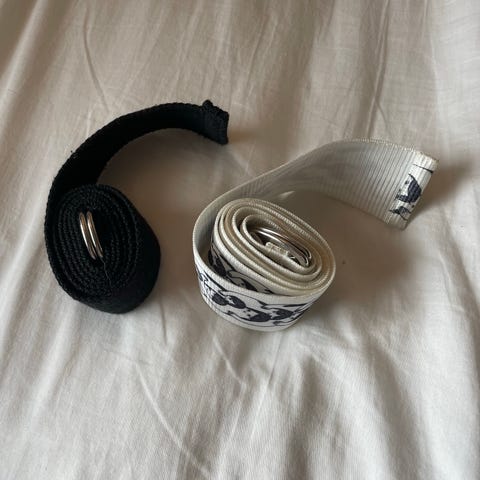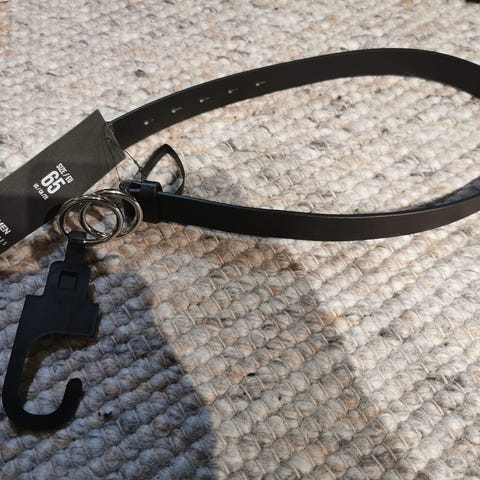 Belte i svart skinn med dekorativ metallspenne og metallbeslag. Fra Monki