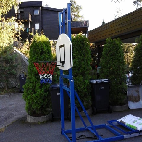 Basketballstativ med kurv (nettet tålte ikke kulde grader, må byttes), justerbar høyde og base for vann eller sandfylling, fylt av sand. Passer til utendørs bruk og kan flyttes ved behov.