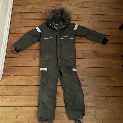 Selger brukt kjeledress fra Didriksons,. Str 120. Avtagbar hette, vanntett, stropper under hæl. Pent brukt, mye bruk igjen. Se bilder. Selges for kr 250.