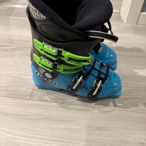 Tecnica Firebird 70 Alpinstøvel størrelse 22,5, tilsvarer ca 35-36. Støvelen har fire metallspenner og stropp øverst for justering. Egnet for alpinbruk.