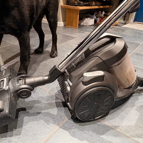 Samsung PowerStick støvsuger i grå farge. Støvsugeren har en kompakt design med tilkoblet slange og håndtak. Den er utstyrt med en støvbeholder og ulike kontrollknapper for enkel bruk.