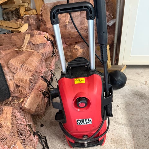 Stor høytrykksvasker selges. Trommel for slange og kabel. To munnstykker (turbo) og beholder for å sprøyte på såpe el.l.