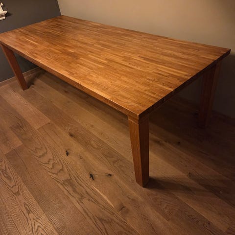 Bord, mørk farge, 200*90 cm. Følger med to stk ileggsplater 45*90 cm. Følger med 8 stoler.