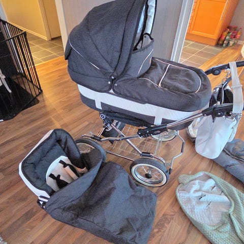 Må med meget tungt hjerte selge min nydelige Emmaljunga Mondial de luxe duo vogn i en mørk gråmelert farge med chrome understell da den ikke brukes mer. Vognen er pent brukt av to barn, men har fått noen slitasje og skjønnhetsflekker, ingenting som har noe å si for bruken. Litt slitasje på håndtak, noen små flekker inni bagen (ikke forsøkt vasket vekk) litt gulnet på innsiden av bag, mulig dette kan vaskes vekk, har ikke prøvd å gjøre det selv. Har fjernet myggnettingen som var i kalesjen da den gikk i stykker, så ny myggnetting må evnt kjøpes ny. Litt lite luft i hjulene, så de trenger å fylles opp. Dette er en fantastisk god vogn med stor og romslig bagdel, stor sportsvogndel med seler, jeg har også trekket til bagdel, vindtrekk/forttrekk til sportsdel, orginalt emmaljunga regntrekk(liten revne ved lufteventil, har ingenting å si for bruk) original emmaljunga vognpose som ble kjøpt med vognen, litt solbleket oppe ved hodet, emmaljunga stelleveske i samme farge som vognen. Har prøvdxå ta bilder av alle "feil og mangler" ved vognen, men tar forbehold om at jeg kan ha oversett noe.