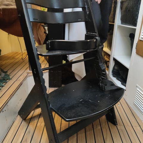 IKEA høy barnestol i hvit plast med grå ben. Stolen er designet for barn og gir en trygg sitteplass ved bordet. Enkel å rengjøre og montere.