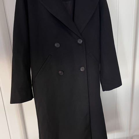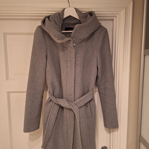 Kjempefin kåpe fra only i ull, størrelse s, farge grå. Jakken har doble knapper foran, høyt krageparti og belte i livet. Ermer og belte i skinn, knaller i metall.
