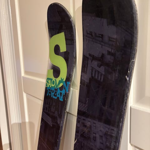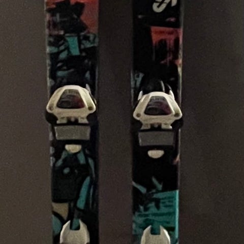 Twin tip med en lengde på 149 cm. Skiene har en rosa og svart fargekombinasjon og er utstyrt med bindinger.