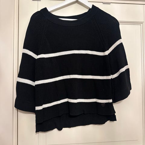 Lager 157 genser i blå farge med hvite striper, størrelse XS. Genseren er laget av viskose materiale og er designet for kvinner.Som ny kr100,-