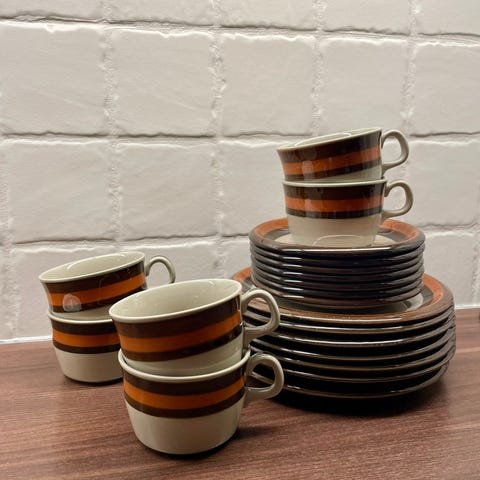 Rörstrand servise bestående av 5 større serveringsdeler, 8 dype tallerkener og 6 eggeglass i keramikk. 70-tallet ?