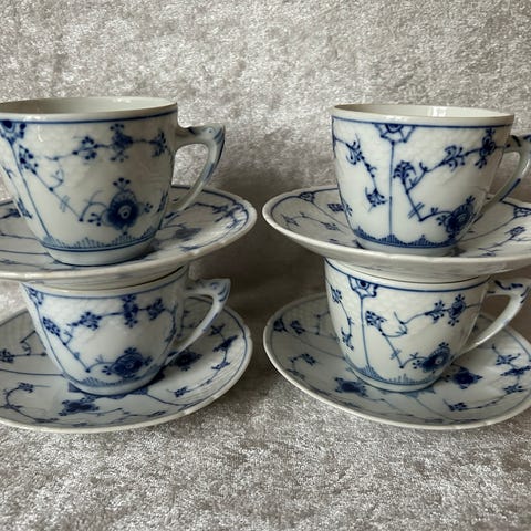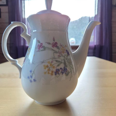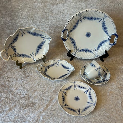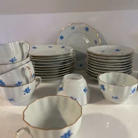 Hvitt gods med fargerike blomster og blå kant samt hank.